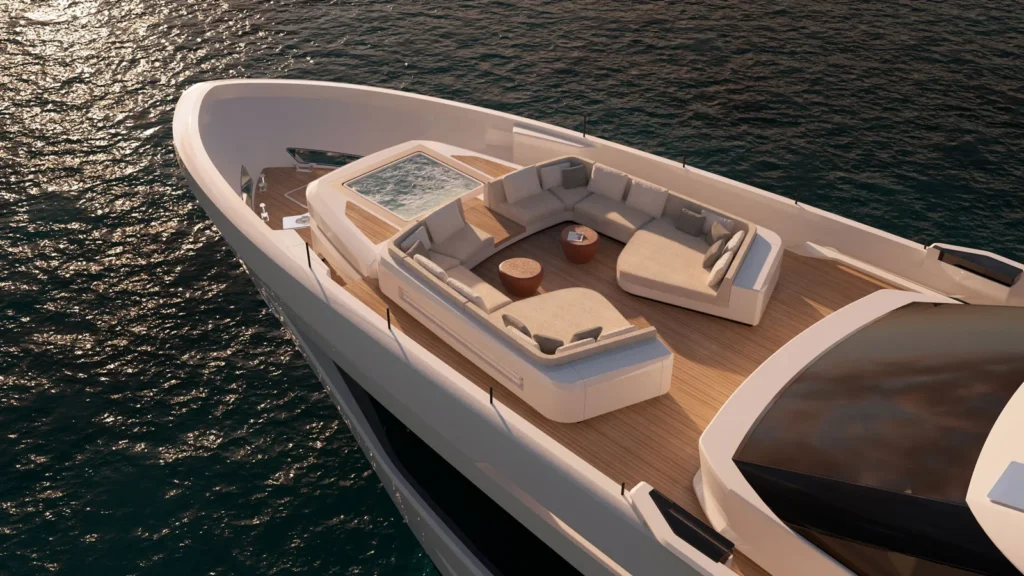 Model highlights include the upper deck skylounge, defined by an inviting closed saloon and a 40-square-metre stern-to terrace, which can be customised to the owner’s lifestyle, and the large bow lounge with sofa seating and a sunbathing area, which can also be equipped with a whirlpool tub.