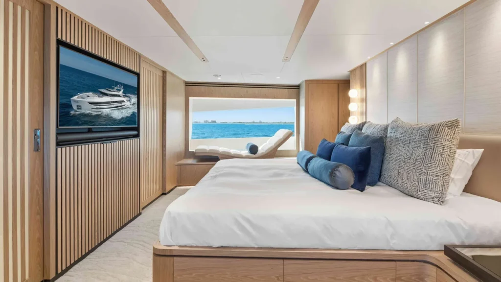 Accommodation is across a five-cabin layout, with a full-beam master suite positioned forward on the main deck and four en suite cabins on the lower deck, comprising two mirrored VIPs amidships, a forward VIP and a portside cabin with convertible twin berths. On board crew accommodations are for up to five, in addition to a captain’s cabin and crew mess.