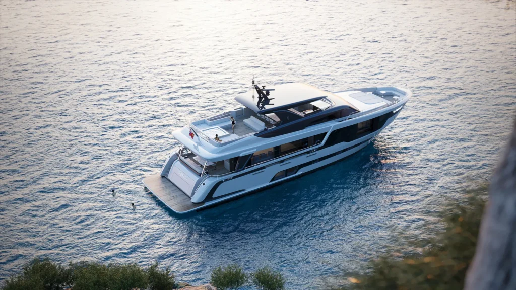 Project Berlin is projected to offer a top speed of 24 knots and a cruising speed of 20 knots thanks to a semi-displacement hull. A two-metre draught will offer access to shallow bays and anchorages.