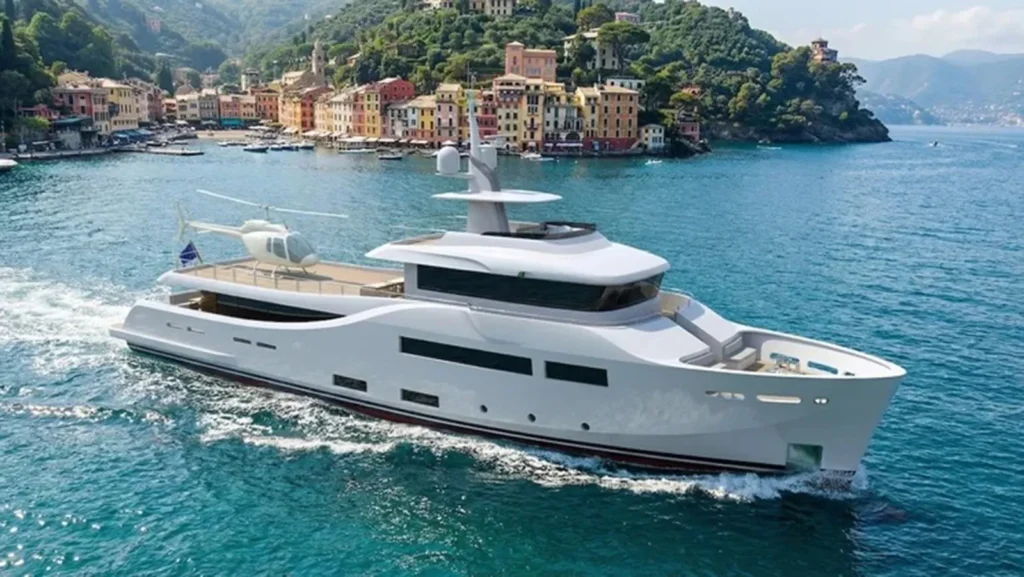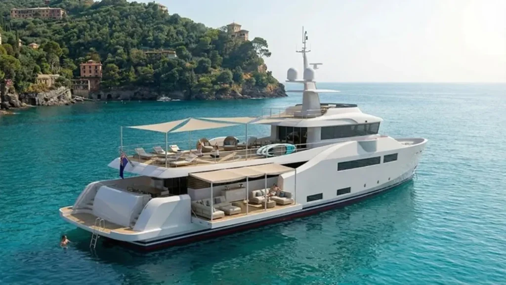 The 40-metre design features a two-metre draught and a 9.5-metre beam, with exterior spaces arranged for social use and day cruising. Open deck areas include a jacuzzi, removable sunshade covers, dedicated storage for tenders and toys, and the option of a certified helicopter landing area.