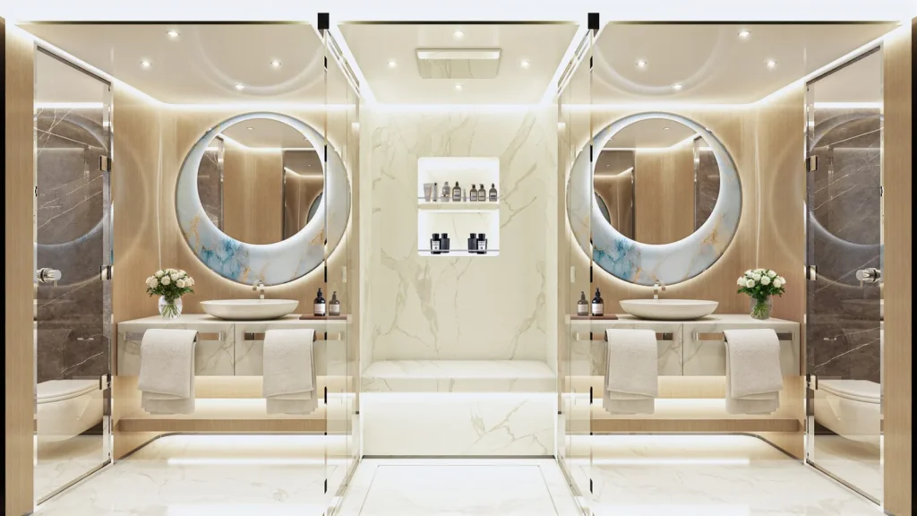 Accommodation is presented for 10 across four guest suites and a generous owner’s suite on the main deck, though the yard noted that the upper deck saloon could be designed as the owner’s suite if preferred. Further quarters accommodate a crew of seven, including the captain, across three twin crew cabins and one dedicated captain’s cabin.