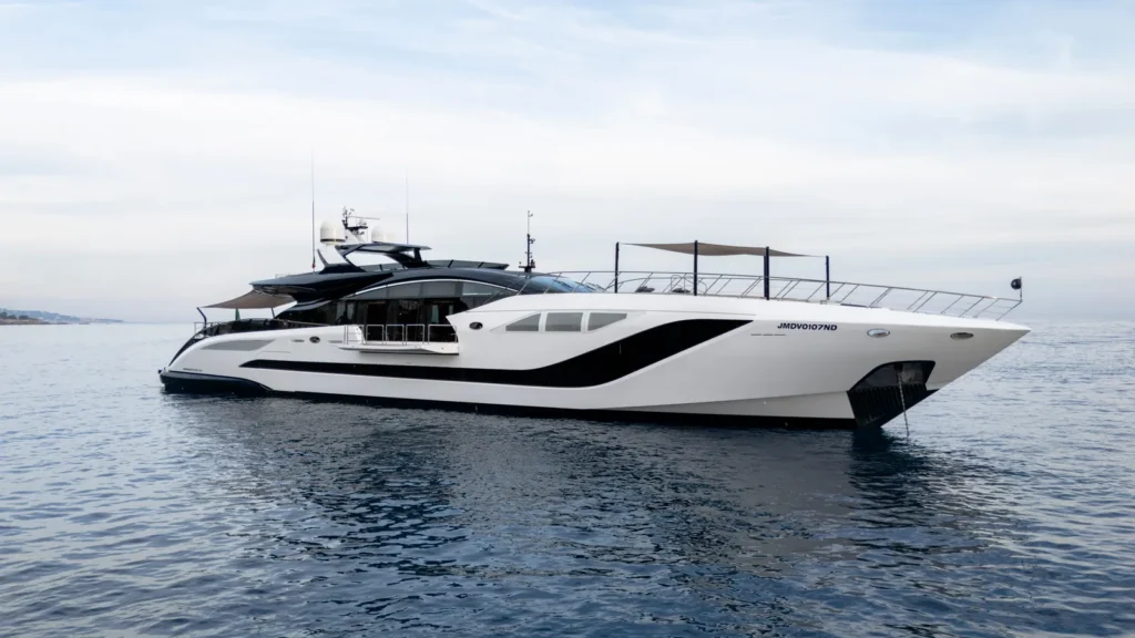 The model is the flagship of Mangusta’s Maxi Open line and is characterised by impressive speed, with four 2,600hp Rolls Royce engines and a Kongsberg Kamewa water-jet propulsion system topping out at 35 knots.