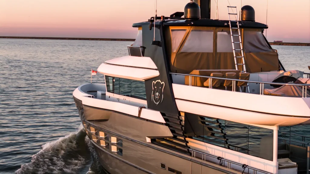 Ursus号的传奇始于2022年,当她抵达位于荷兰乌尔克的Balk船厂时,还是一艘不足24米的Acico船厂建造的游艇。在与荷兰设计工作室Mulder Design的紧密合作下,一场彻底的变革拉开了序幕。重建计划的核心是全新的船艏和船艉设计,这一改动使其总长度增加了整整六米。同时,更长的上层建筑为主沙龙、阳光甲板和沙滩俱乐部创造了更为宽裕的空间。为了彰显其独特身份,船身被喷涂为与她的新座驾路虎揽胜相匹配的金属“Lantau Gold”色,尽显低调的奢华。