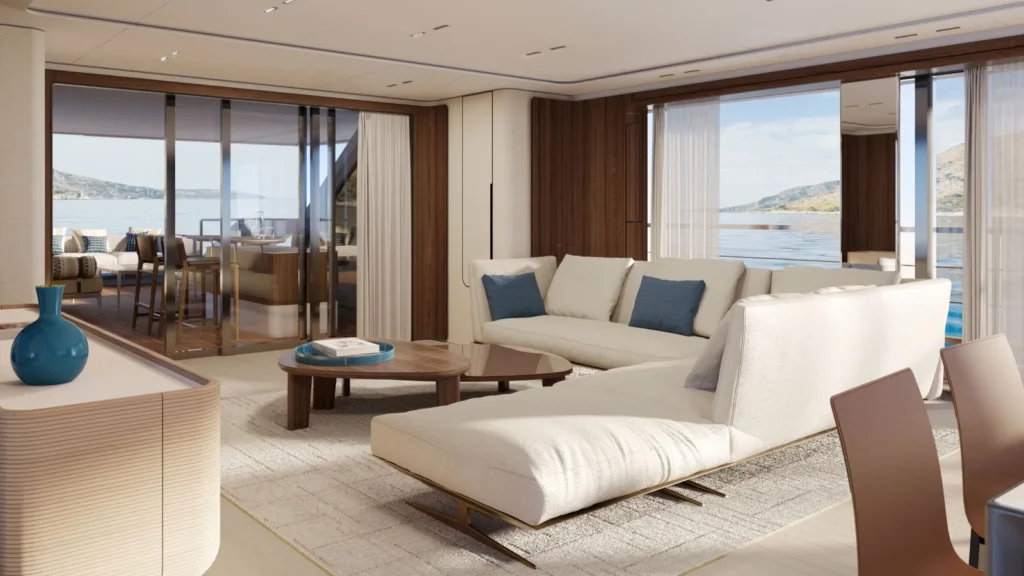 该船型的亮点包括上层甲板的空中沙龙,其封闭式会客厅温馨宜人,并连接一个40平方米的船尾至船头的露台,可根据船东的生活方式进行定制。船艏的大型休息区设有沙发和日光浴区,还可选配按摩浴缸。