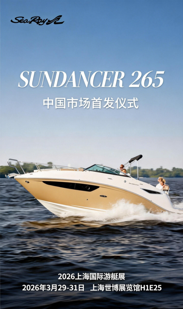 全新SUNDANCER 265的登场不仅标志着Sea Ray对中国市场的坚定承诺,更将为中国游艇生活方式开启崭新篇章。我们诚邀您于2026年3月29日至31日亲临上海世博展览馆,共同见证这场融合匠心工艺与航海梦想的盛会。期待与您相聚浦江之畔,共启精彩航程。