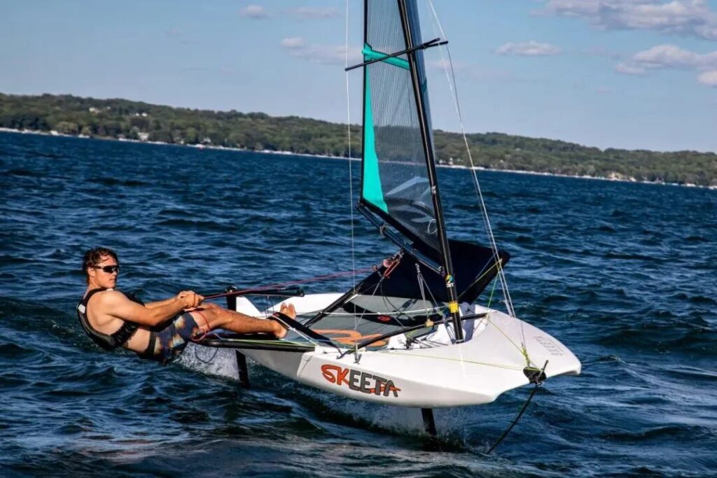 装上水翼后不易失控、接近国际飞蛾级别的高效水翼船Skeeta,能为驾驶者带来迎风滑行和水翼转向(Foil-Tack)的极佳体验。不使用水翼时,也能作为普通的小帆船航行,相比船体狭窄的Skiff高速艇,Skeeta更安全、更易上手。