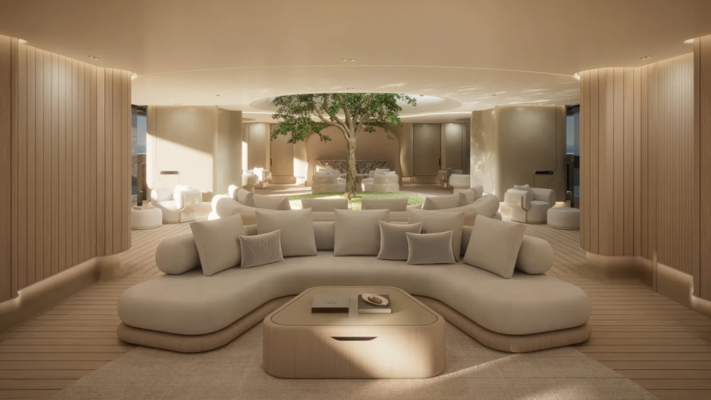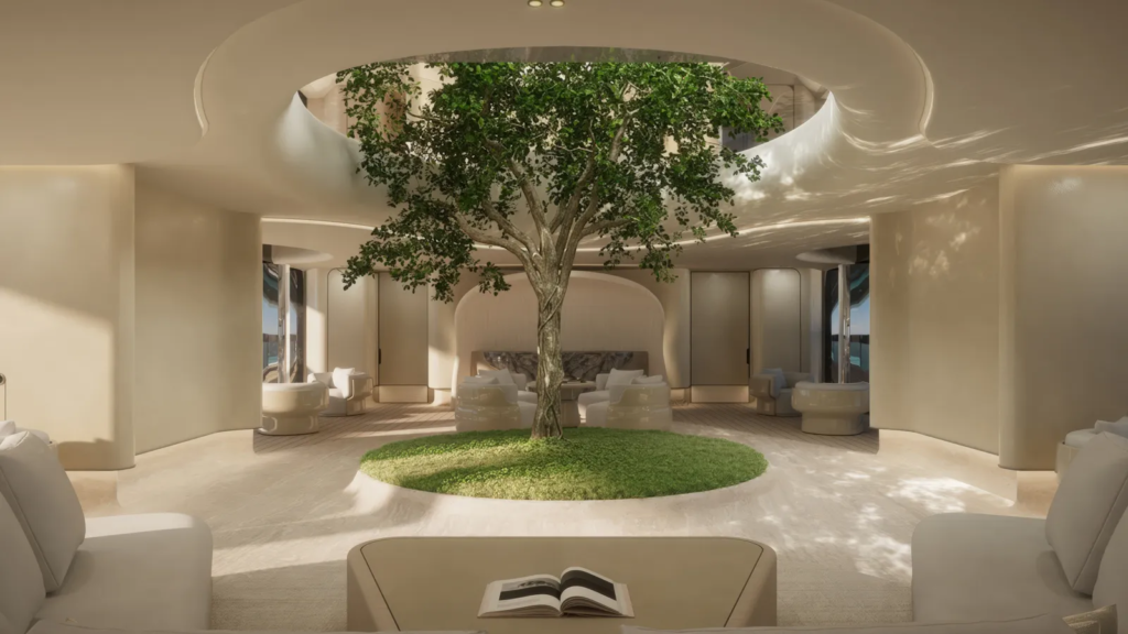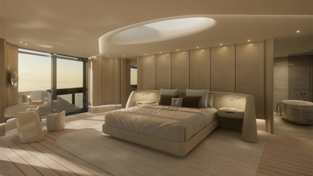 主沙龙环绕着这棵树呈曲线分布,前方设有休息座椅和吧台区;船中部设有一个三层通高的大堂,配有深色漆面铝制楼梯和电梯,以及一个定制酒窖。前部的客区包括两间客舱、一间VIP舱以及两间主人套房中的第一间,床铺面向窗户,以腾出更大的更衣室和浴室空间。