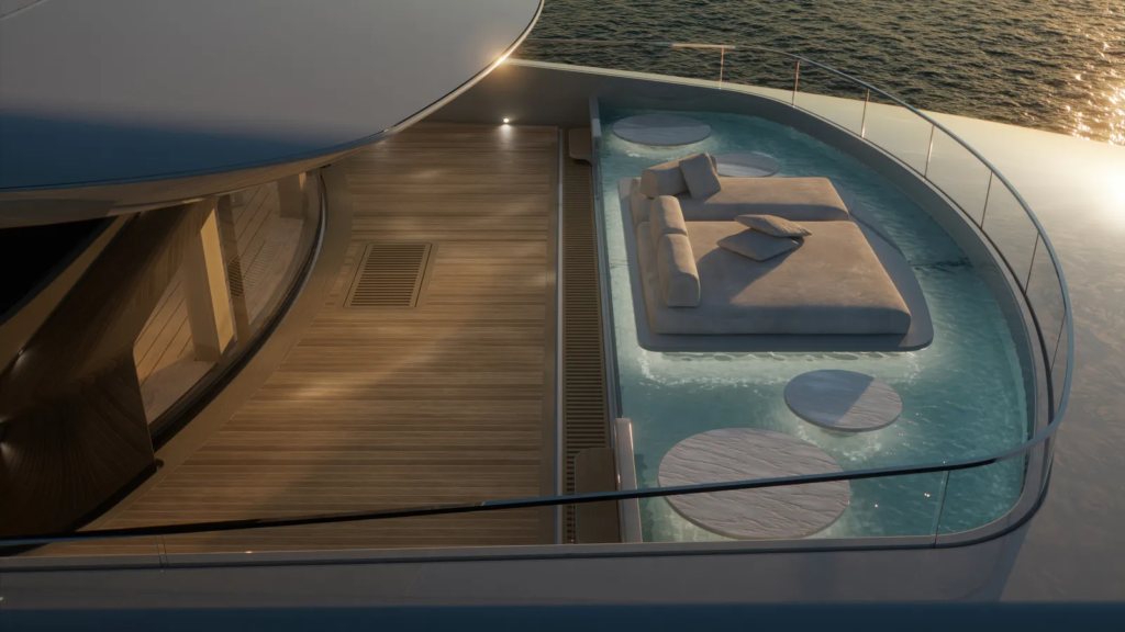 上层的专属主人甲板设有第二间主人套房(室内外总面积约140平方米)、位于后部的电影休息室,以及一个俯瞰船首的“倒影”玻璃底泳池。前部空间被开发为一个多功能平台,配有可拆卸座椅和感官淋浴间。在日光甲板上,原来的外部区域被重新设计为一个健身房,其船首、船尾和两侧均配有可开启的玻璃。