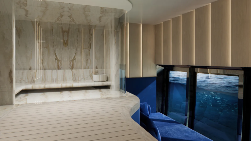 在海滩区的前方,水疗健康区内设有一个水族馆,该区域还配有土耳其浴、桑拿房、按摩室、冷疗室、Posarium理疗室以及一个可开合的露台。船体部分半潜的玻璃区域将舷侧外壳变成了水线以下的窗户,并配有座椅供人欣赏水下风景。