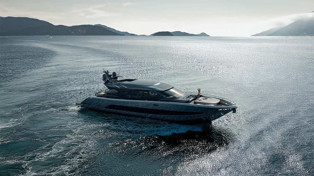 在户外甲板方面,社交区域规划得十分巧妙,包括一个开阔的露天驾驶舱以及位于船尾的海滩俱乐部。其中,海滩俱乐部的空间极为充裕,不仅能轻松停放一艘4米长的接驳艇,还能搭载摩托艇及众多充气式水上玩具,并为直接下水提供了极为便捷的通道。在内部住宿方面,该游艇最多可容纳8名尊贵的客人。主甲板设有一间全宽尺寸的船东套房,室内运用了多种经过精心挑选的考究材质进行装饰,营造出极具现代感与奢华感的居住氛围。