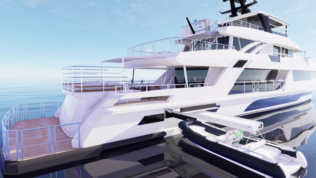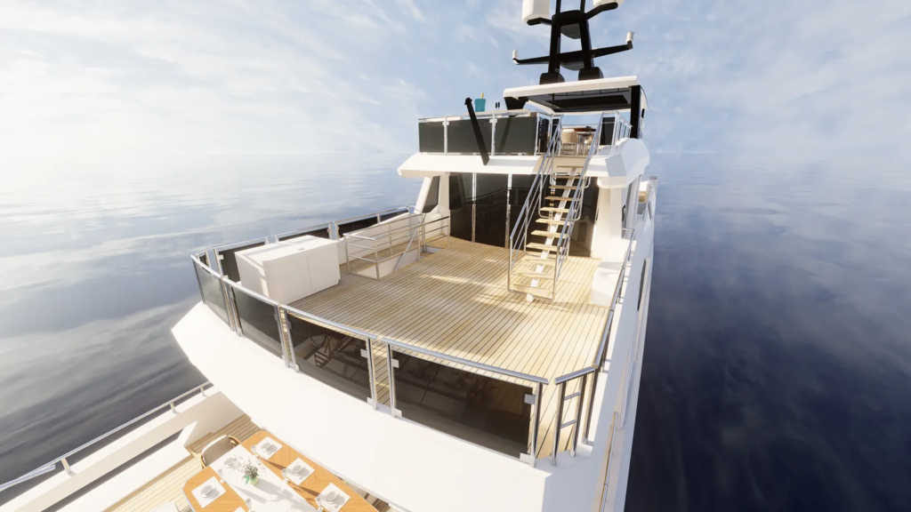 项目渲染图展示了游艇的新车库(上图)和上层甲板楼梯(下图)